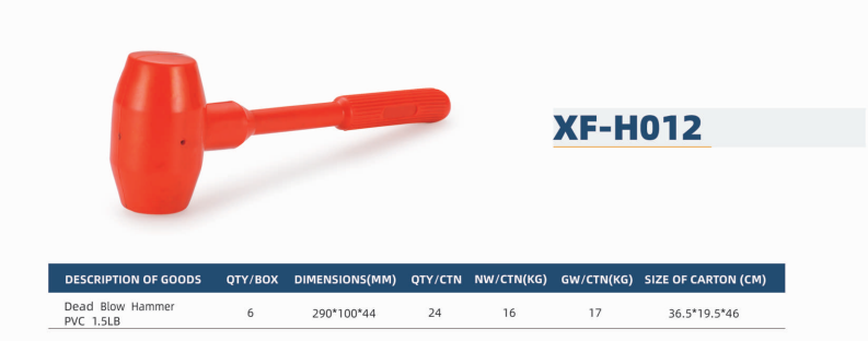 无弹力锤XF-H012是锤子中的一种,也是锤子厂家批发中比较受欢迎的一类,和传统锤子相比,无弹力锤在使用的时候更加安全,不会因为回弹问题而伤害到使用人员。
